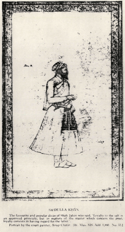 Who was Sadullah Khan? One account claims his elders were settlers of Arab origin once upon a time, much like the poet Waris Shah, although Tahqiqat-E-Chishti claims he was a Jatt, but provides no source. Either ways the fact he is described as a Shaikhzada by Mughal accounts confirms his local roots. [2] French traveller Francois Bernier in his book Travels in Mogul Empire “Sadullah-Kan, who, from being an Indian by birth, had excited the jealousy of the Persians at court.” [6]