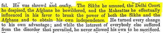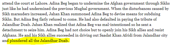 Adina Beg did not plunder his own doab after expelling Afghans. Maybe if it was just one thing, clearly a pattern starts to emerge. Just ridiculous. Syed Latif says “His management of the Jullundher doab was highly successful” [12]